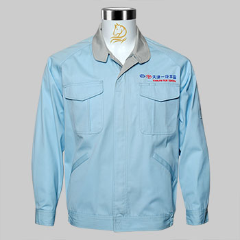 天津一汽豐田汽車工作服款式圖:淺藍的工作能給員工提供冷靜的情緒,拼淺灰色的領子,是服裝更加耐臟。日本工作服傳統領型,體現企業文化。42,76,64,65,122,123,59